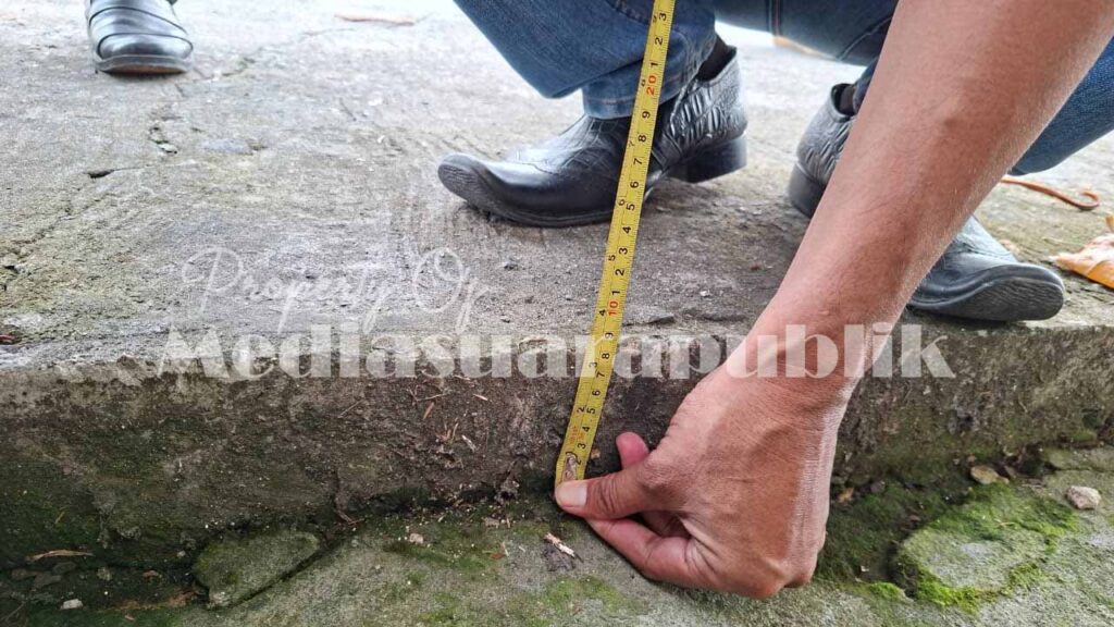 “Standarnya rabat poros desa itu 15 cm. Tapi saat kami lakukan pengukuran rata-rata hanya 13 cm. Ini tentu menimbulkan dugaan bangunan ini dikerjakan tidak sesuai dengan pagunya,” kata Suliono.